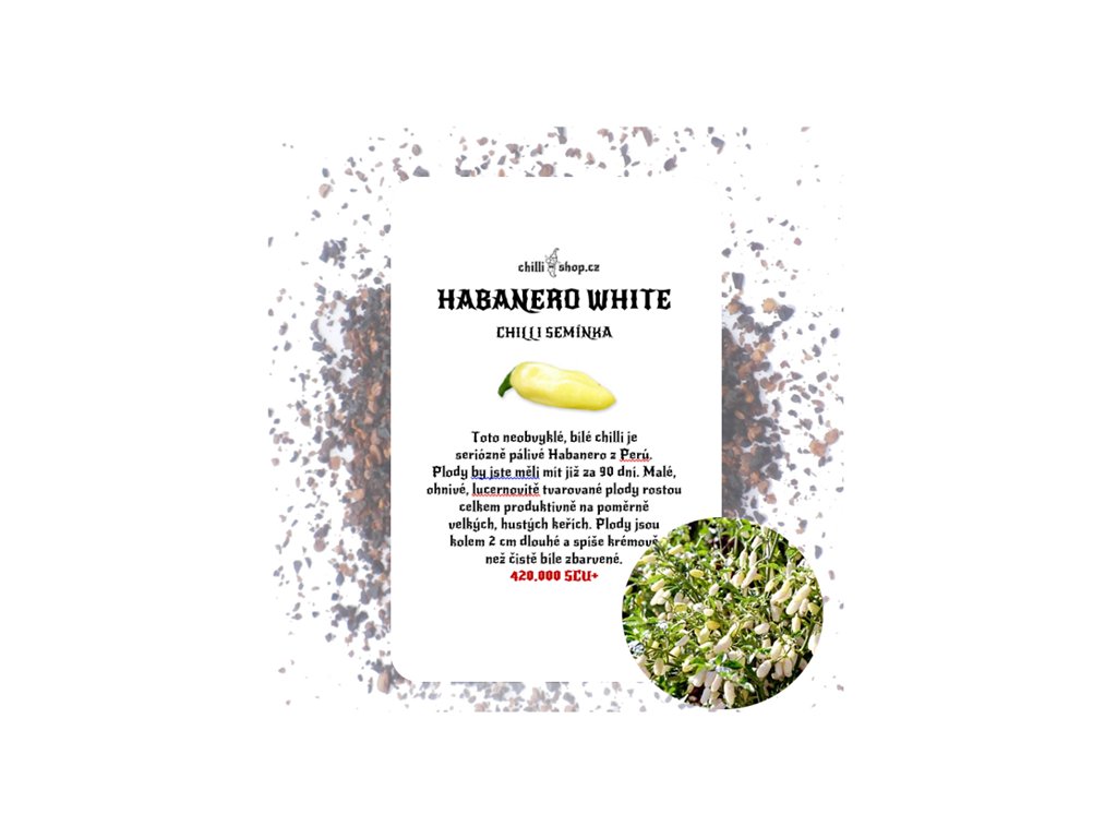 Tato neobvyklá, bílá chilli paprička je seriózně pálivé Habanero z Peru, pyšnící se 420.000 SHU. Plody by jste měli mít za 90 dní. Malé, ohnivé, lucernovitě tvarované plody rostou celkem produktivně na poměrně malých, hustých keřích. Plody jsou kolem 2 cm dlouhé a spíše krémové než čistě bíle zbarvené. Je to neobvyklé a zvláštní chilli do vaší pálivé sbírky.