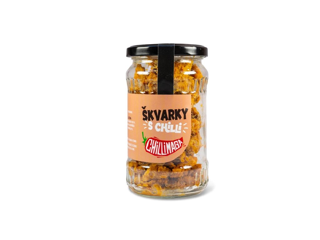 Tradiční zabijačkové jídlo netradičně s chilli. Je to prostě chuťovka na mlsání, ale když potřebuješ rychle zahnat hlad na delší dobu, také dobře poslouží. Bez éček a umělých barviv. Hmotnost obsahu 172 g. Složení: vepřové škvarky (vepřové sádlo, mléko, sůl) 99,6% , sušená chilli paprička Habanero 0,4%.